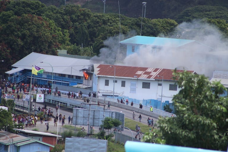 Banner image: a leaf hut outside the Solomon Islands parliament building burns during the November 2021 riots. Image courtesy of Elliot Dawea.